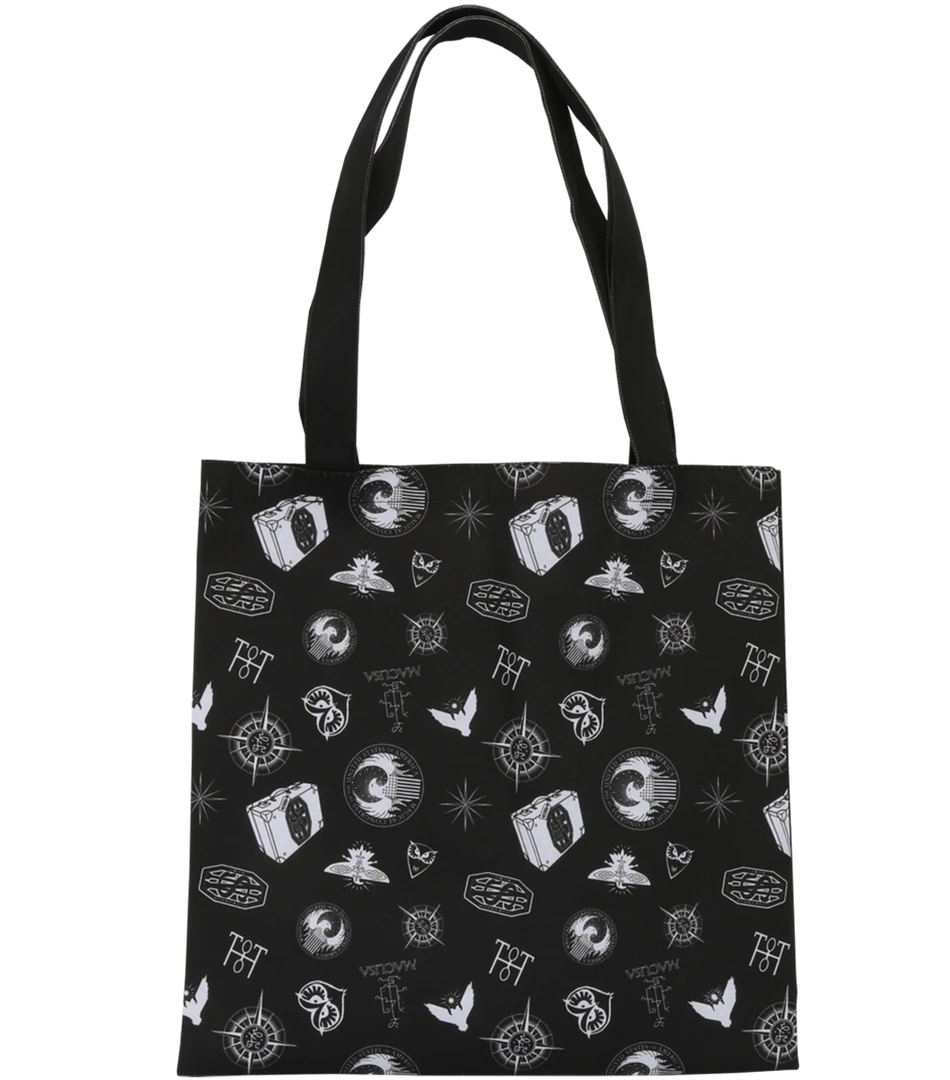 A beautiful black tote bag featuring white symbols from Fantastic Beasts and Where to Find Them.