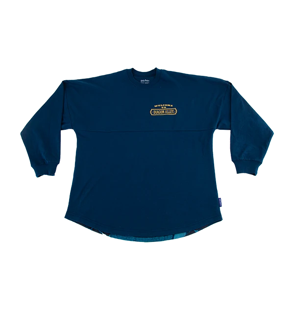 This long-sleeved jersey reads ‘Welcome to Diagon Alley’ with a Diagon Alley street sign in gold foil transfer on the front chest. On the back, ‘Diagon Alley’ is emblazoned in metallic gold font broadly across the shoulders. Exclusive artwork of Diagon Alley can be seen printed on the bottom back down to the hem, and offers up a stunning street scene of the various magical shops in cerulean blue. Showing off your Harry Potter fandom has never been so fun… or so bold.