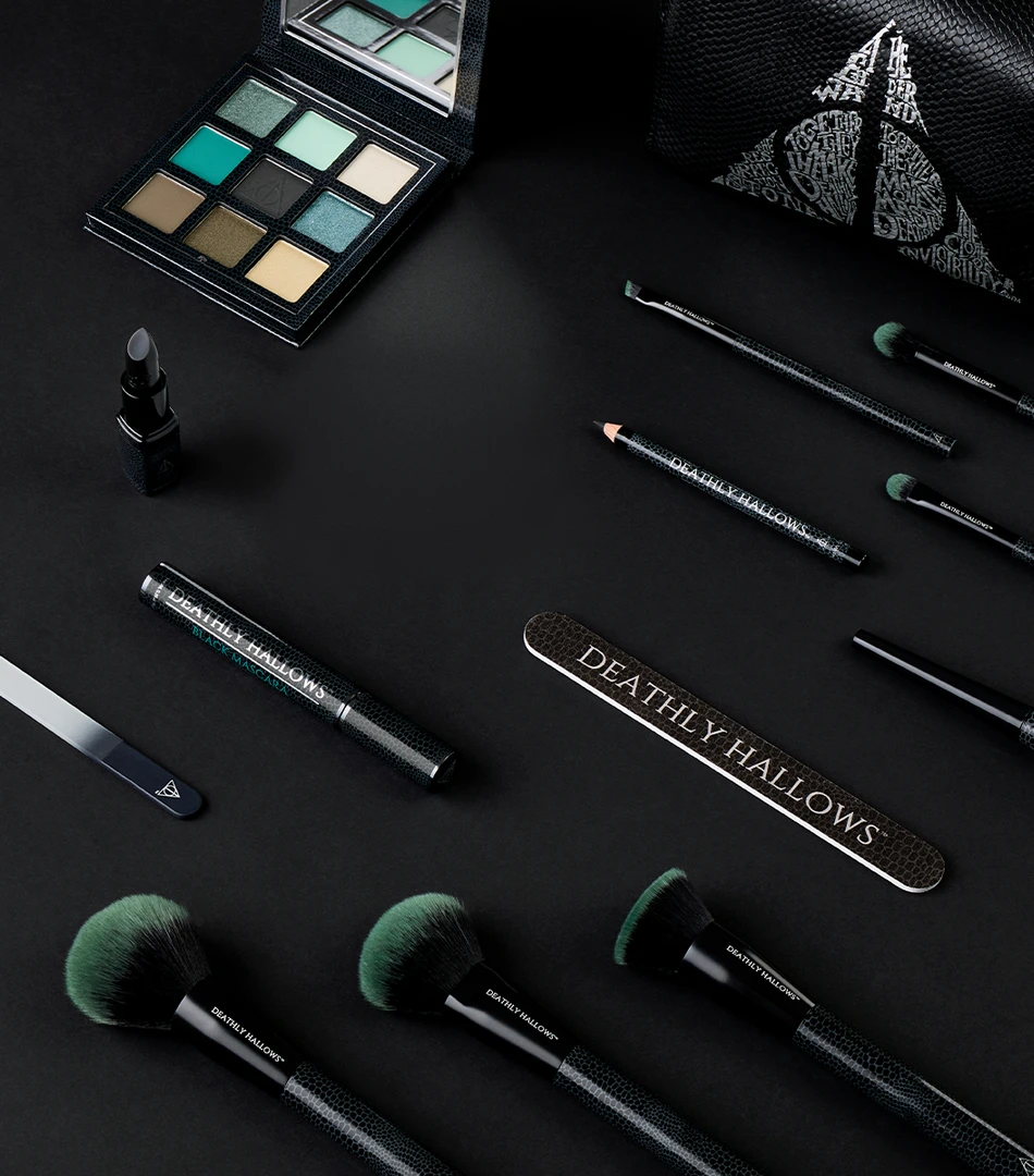 Embrace the darker side of magic with this eight-piece Deathly Hallows makeup collection set. The vegan and cruelty-free range comes in black snakeskin effect packaging and features the iconic Elder Wand, Resurrection Stone and The Cloak of Invisibility that together make up the symbol of the Deathly Hallows.