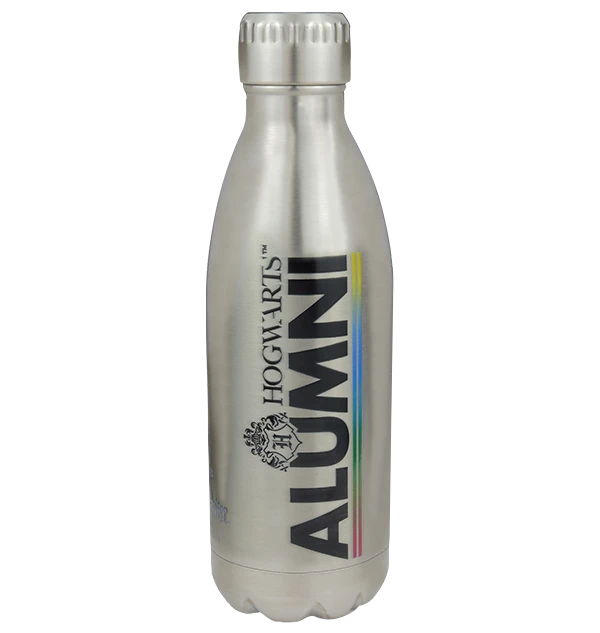 On the back, you can find the words “Hogwarts Alumni”, with a small crest and underlined with a spectrum of the house colours. This flask is complete with a screw top to ensure a tight seal.