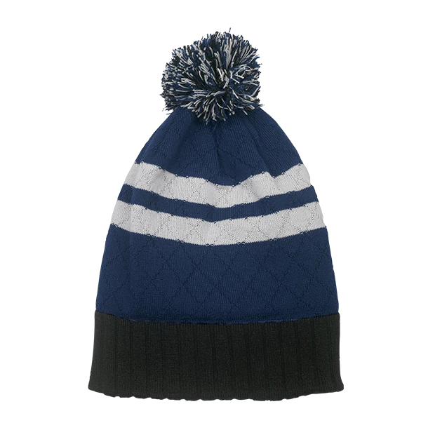 The thick ribbed headband features an embroidered patch of the house crest on the front, while the fun bobble on top sets the tone in a frosty white and blue mix. Two white stripes run the circumference of the beanie which sports a cosy quilted looking base.